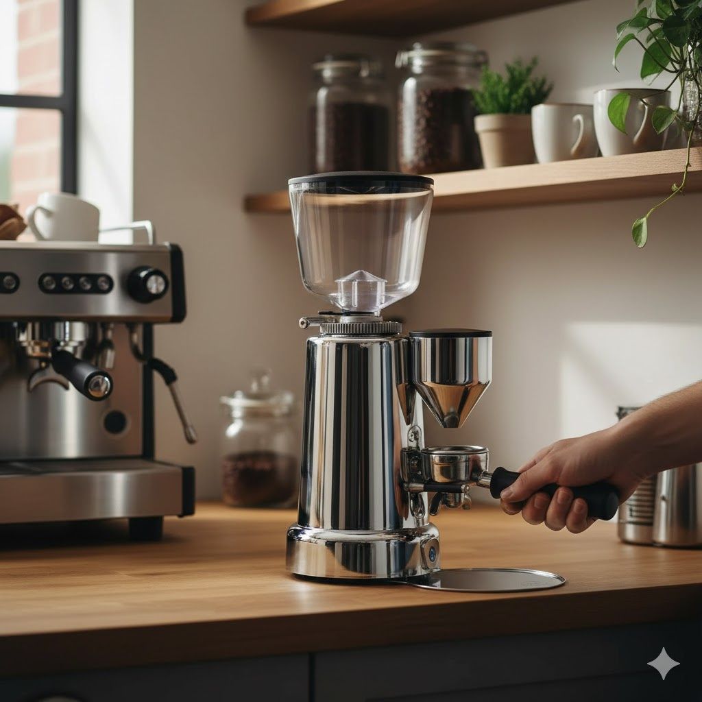 Polohovatelná vidlice "Hands-Free" je skvělá věc. Zasunéš páku, mlýnek si ji podrží a namele přesnou dávku, zatímco ty si můžeš třeba přichystat šálky nebo se jen kochat tím tichem.