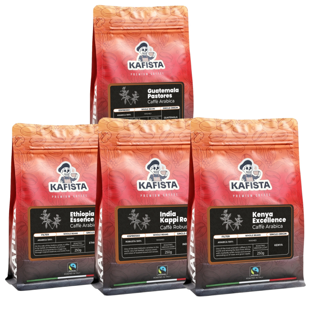 Kafista balíček 4x250g - Single origin kávy pražené v Itálii, zrnková káva Fiartrade
