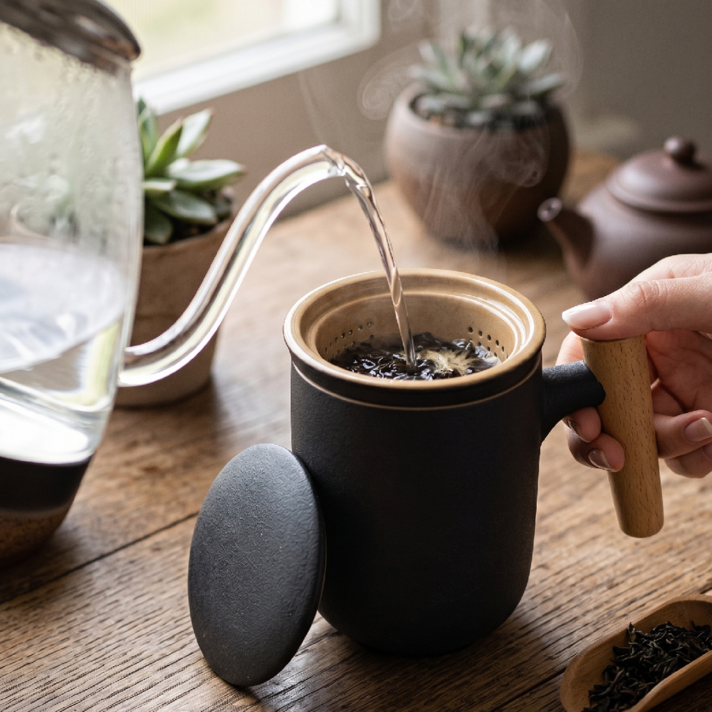 Design, který strhává pozornost. Pokud hledáte čajový doplněk, který okamžitě zaujme každou návštěvu, Aura Nordic Wood v černé barvě je tou správnou volbou. Luxusní vzhled temné keramiky dokonale koresponduje s hřejivým tónem dřevěného madla a přináší do vašeho čajového rituálu naprostou exkluzivitu.
