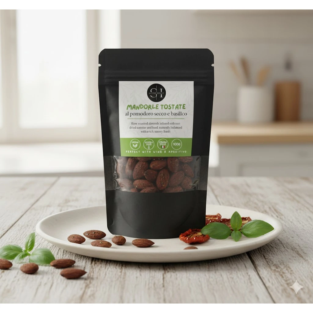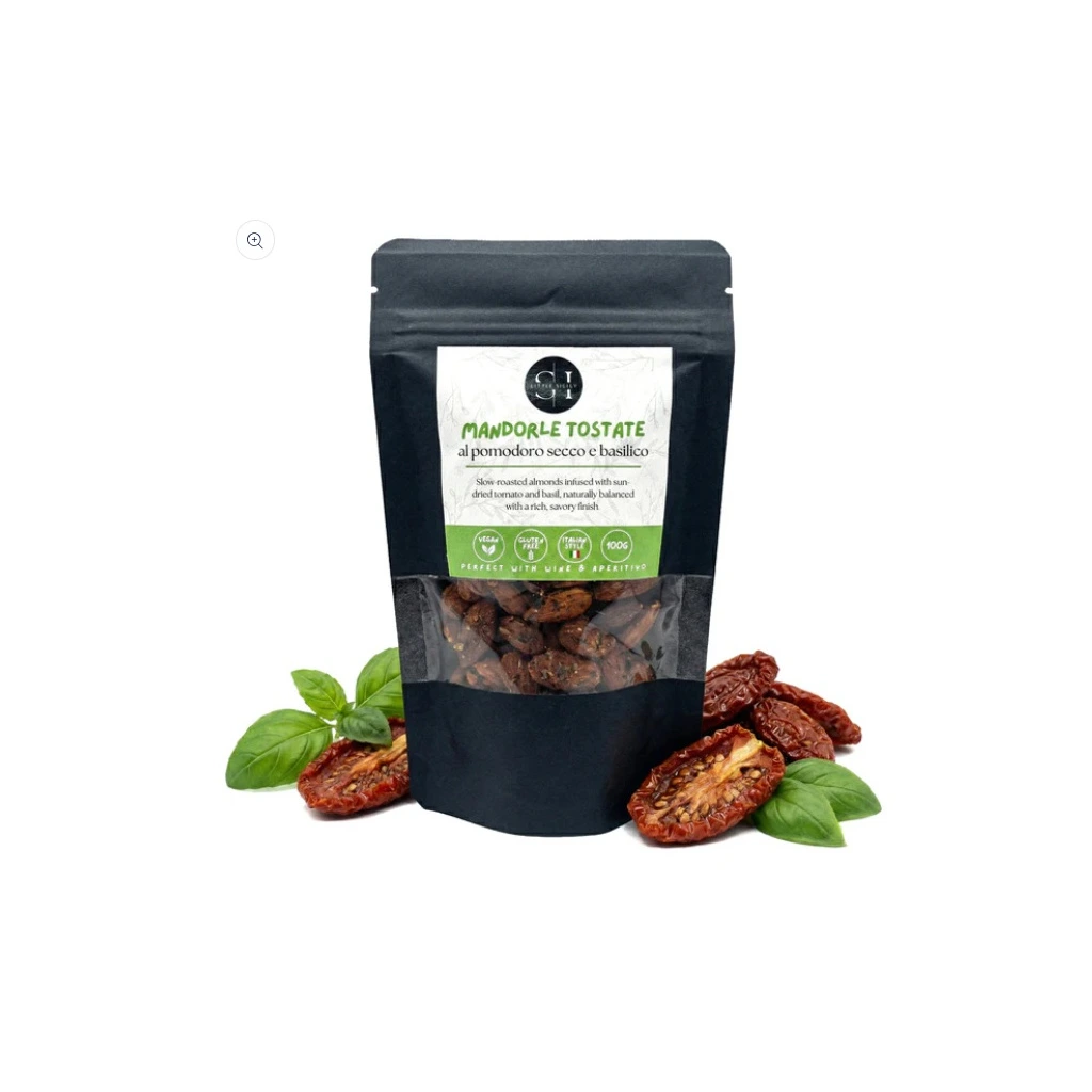 Výběrové mandle, sušená rajčata, sůl a bazalka. Bez umělých aromat a barviv. Prostě tak, jak by to udělala italská nonna, ale v moderním balení pro každého dobrodruha.