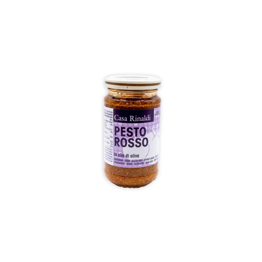 Rehydratovaná sušená rajčata (40 %), slunečnicový olej, bazalka, rajčatová dřeň, kešu ořechy, sýr (mléko, sůl, syřidlo, konzervant: lysozym z vajec), sýr Pecorino (ovčí mléko, sůl, syřidlo), sůl, česnek, regulátor kyselosti: E270.