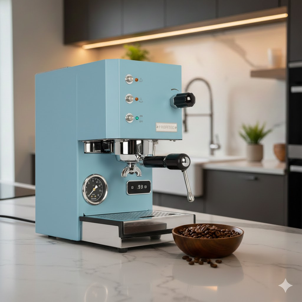 Pokud je červená verze o energii a dravosti, modrá varianta Profitec GO přináší do přípravy kávy klid a rozvahu. Je to stroj pro ranní rituály, kdy nechceš spěchat, ale zároveň nechceš čekat 20 minut, než se kávovar nahřeje. Díky chytré konstrukci a režimu Fast Heat-Up je GO připraven dřív, než nameleš kávu. A s modrým lakováním? Je to designový solitér, který na sebe nestrhává pozornost křikem, ale svou aurou.