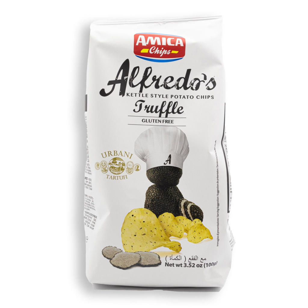 Popis výrobku: "Alfredo's Gourmet Black Truffle" od Amica Chips jsou ručně vyráběné křupavé gurmánské bramborové lupínky, naplněné vůní černého italského lanýže. Tyto ručně vařené bramborové lupínky si vás získají svou nezaměnitelnou křupavostí.Použití: Nejlépe si je vychutnáte se svými přáteli jako aperitiv. Alergeny: Bezlepkové, Bez konzervantů Hmotnost: 100g Nutriční hodnoty:Energetická hodnota na 100g 2005 kJ/479 kcalTuky 23,8g z toho nasycené mastné kyseliny 2g Sacharidy 56,8g z toho cukry 1g Bílkoviny 7g Sůl 1,2gSkladování: Po otevření uchovejte v chladu a suchu.