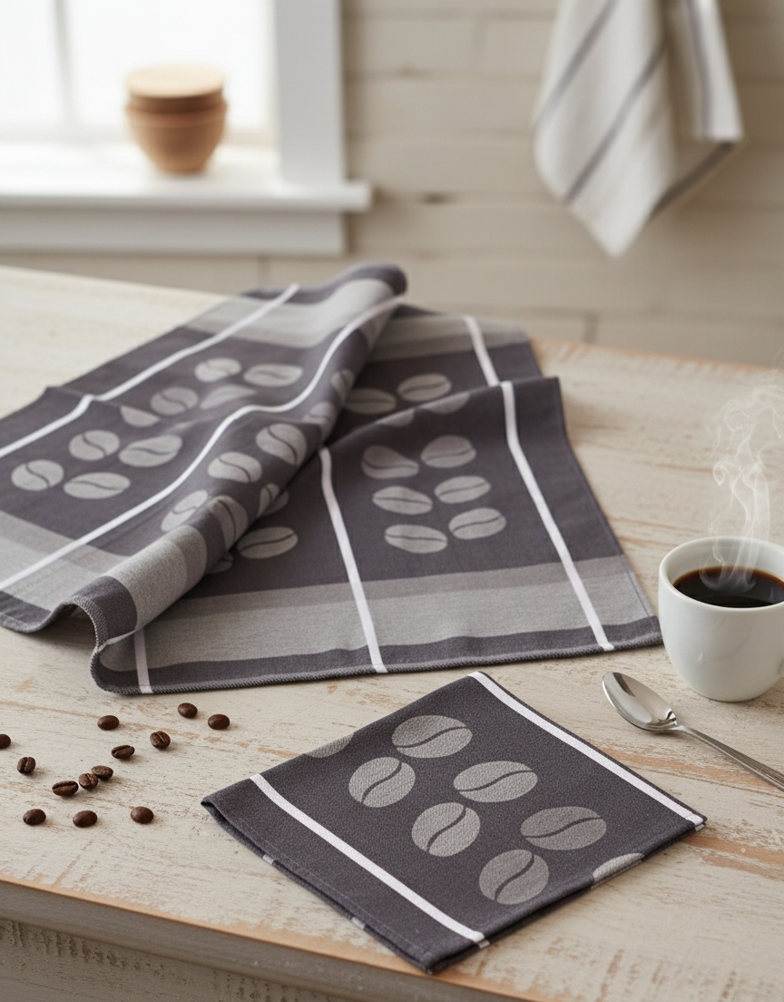 Díky žakárové technice tkaní je motiv na látce vytvářen přímo při výrobě, což zaručuje jeho trvanlivost i po mnoha praních. Kombinace různých odstínů šedé barvy působí moderně a elegantně – hodí se do každé kuchyně, od rustikální po minimalistickou.