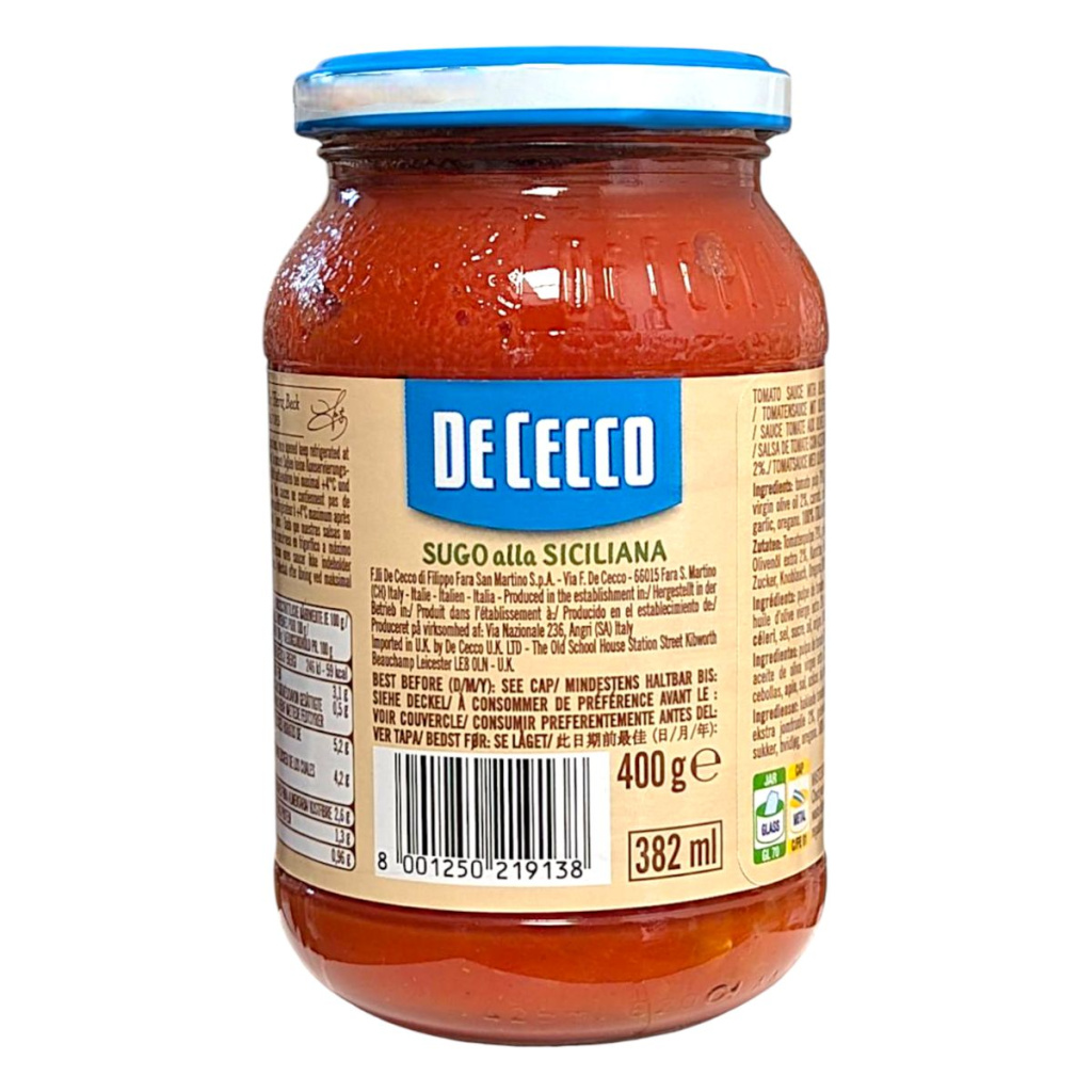 Složení: Rajčatová dužina (79 %), zelené a černé olivy (11 %), extra panenský olivový olej (2 %), cibule, celer, sůl, cukr, česnek, oregano.