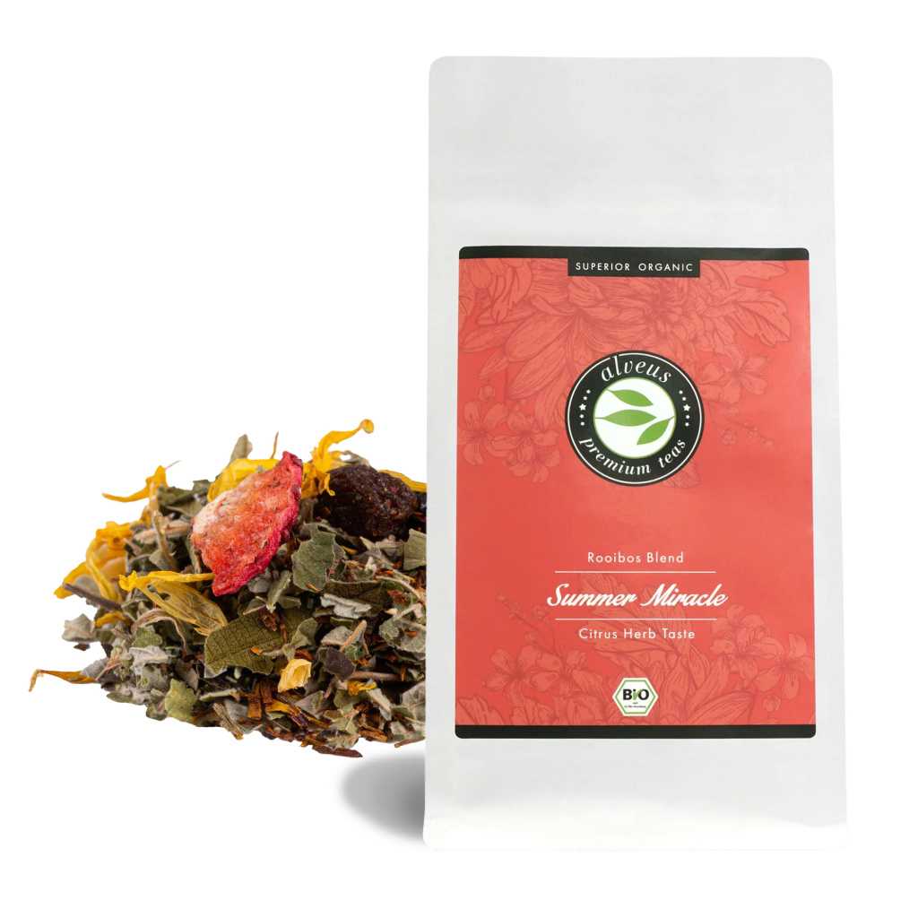 Objevte jedinečnou bylinnou směs Summer Miracle, která spojuje jemný rooibos s výraznými citrusovými a bylinnými tóny. Čaj obsahuje přírodní ingredience, jako je verbena, máta klasnatá, fenykl, ibišek, zázvor, lékořice, kurkuma a jahody. Tato směs je bez kofeinu, takže ji můžete vychutnat kdykoliv během dne. Rooibos v BIO kvalitě pochází z ekologického zemědělství a zaručuje jedinečný chuťový zážitek. Čaj je ideální volbou pro chvíle relaxace nebo jako dárek pro vaše blízké.